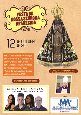 A Comunidade Nossa Senhora Aparecida, da Paróquia Santa Clara e São Francisco, também celebra a padroeira. A comunidade fará um tríduo com início na sexta-feira, 9/10. No primeiro dia haverá celebração da Santa Missa, às 20h, na comunidade paroquial - rua Portugal, 210, bairro Águia Dourada, Ibirité.No domingo a celebração também será às 20h.
